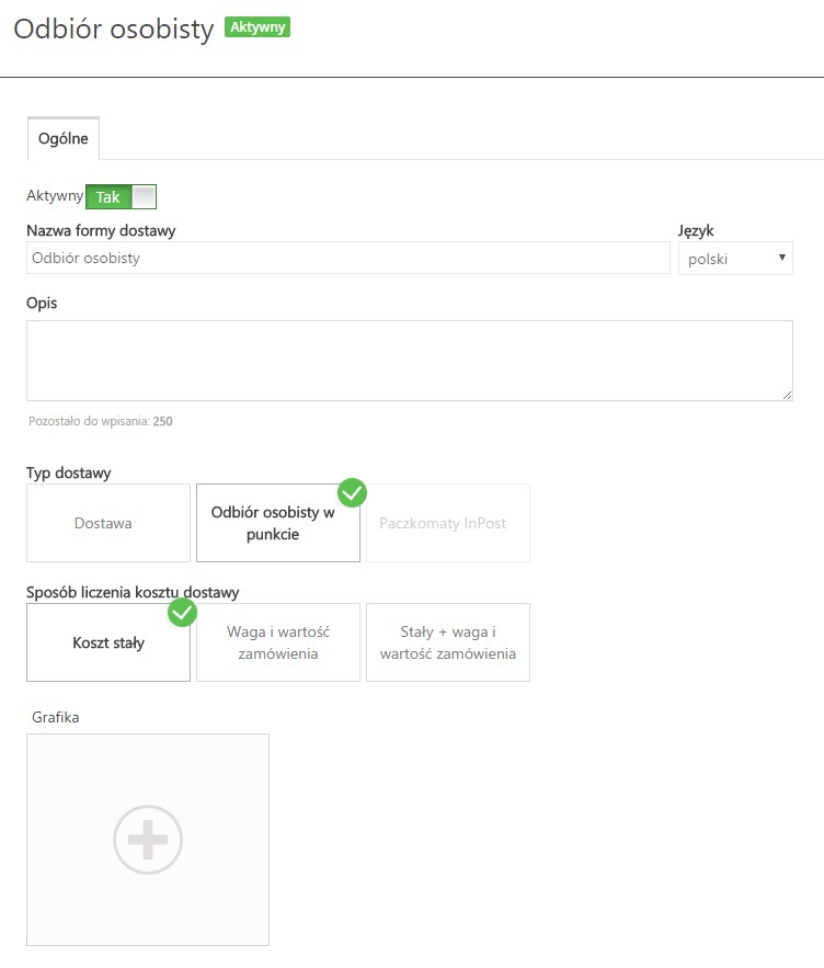 Cliquez ensuite sur la mosaïque Réception personnelle. Ceci fait, la fenêtre où vous pouvez modifier le statut du mode de livraison, sa description dans la boutique, ajouter les détails, modifier le type de livraison et la méthode de calcul des frais de livraison et ajouter une image qui représente le mode de livraison s’ouvre.